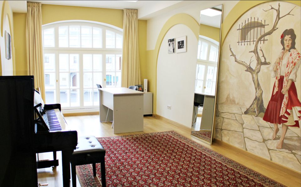 Фасад Международной Академии Музыки Елены Образцовой не случайно окрашен в два цвета: зеленый и желтый. Эта цветовая гамма символизирует собой ход истории Санкт-Петербурга, так как окраска здания отражает менявшуюся архитектурную моду. Зеленый цвет напоминает о XVIII столетии (по приказу Императрицы Екатерины II каменные строения Северной столицы должны были иметь яркие, радующие глаз цвета, чтобы украшать мрачный и сумрачный колорит города), а желтый – о XIX веке.