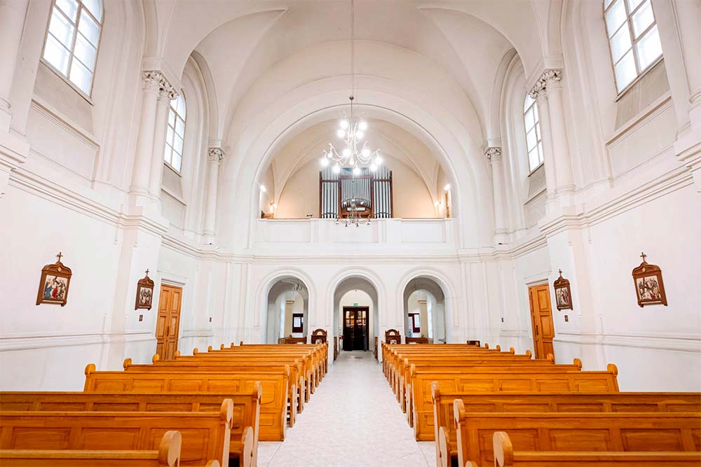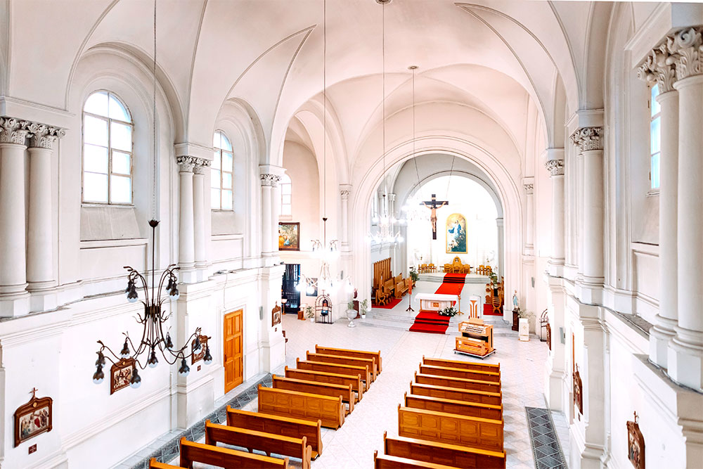 Несмотря на то, что католический храм Успения Девы Марии находится в оживленном районе Петербурга, найти его не так уж просто: он спрятался за зданием Католической семинарии, что на 1-й Красноармейской улице. Некогда этот храм был прокафедральным собором, в нем же была резиденция главы Католической церкви на территории России.