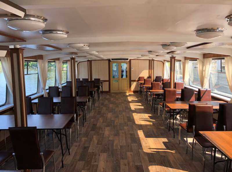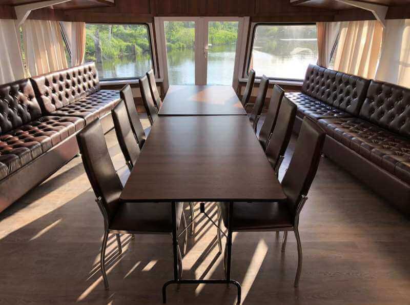 Эксклюзивная отделка салона, стилизованная мебель – все разрабатывалось под целевые мероприятия. А именно юбилеи и дни рождения уважаемых гостей. Стильные диваны в носовой части, гармонично подобранные цвета.