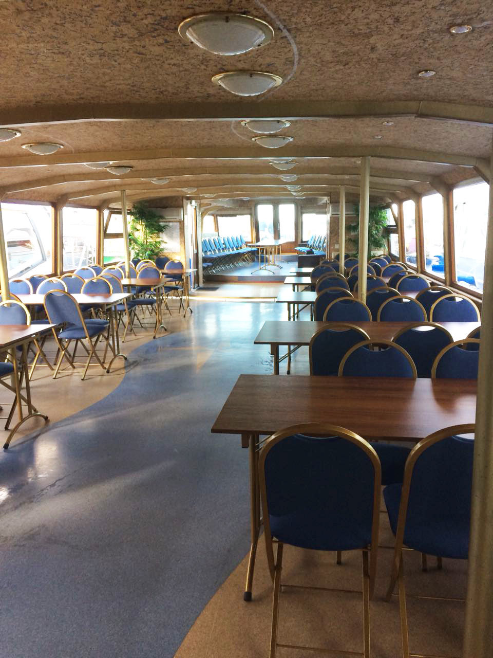Верхняя палуба представляет собой большую крытую террасу. Это удобная площадка для фуршета или мероприятия на открытом воздухе.