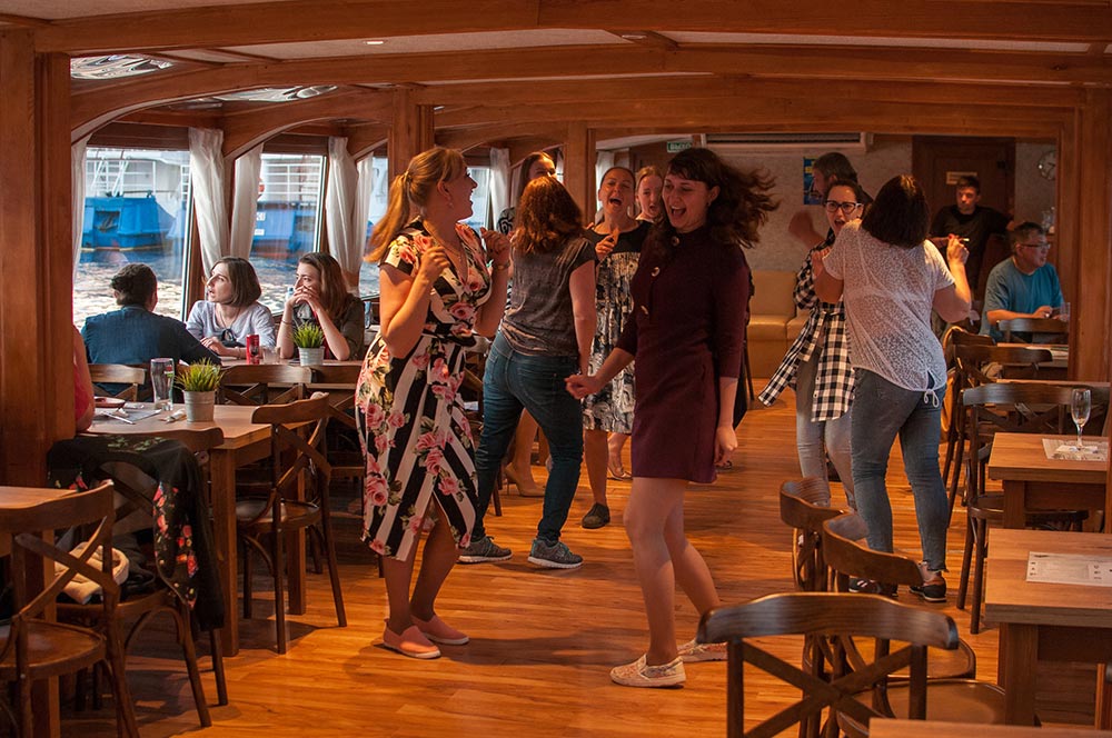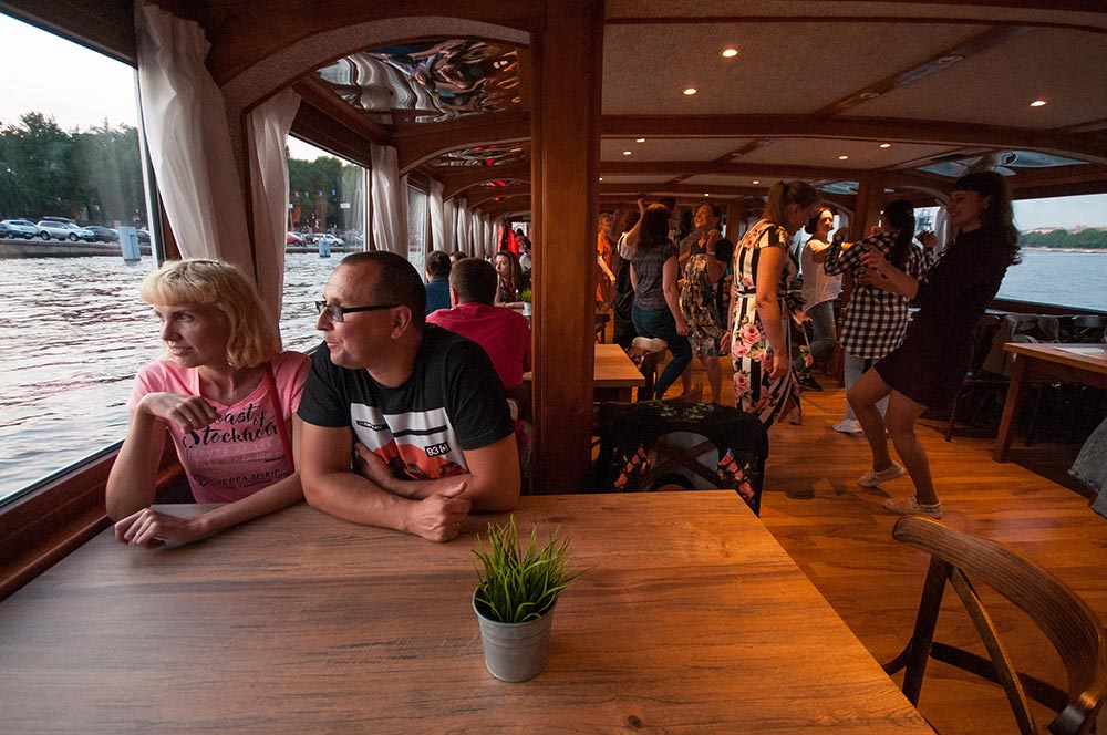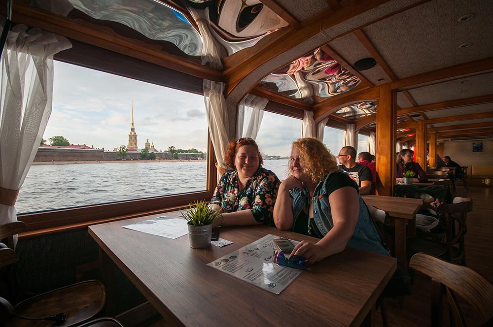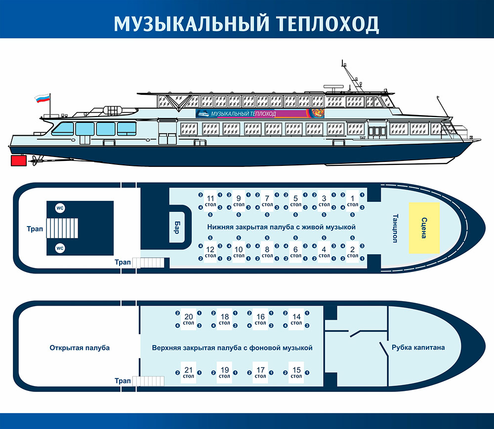 На нижней палубе звучит живая музыка в исполнении кавер-групп Санкт-Петербурга. На верхней палубе – фоновая музыка.