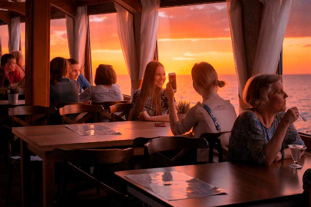 За окном сменяющиеся декорации парадного Петербурга, заката в Финском заливе и гигантские пролёты разводных мостов. Официанты приносят вкусные блюда, бармен готовит прохладительные напитки. Ваша задача - отдыхать и получать истинное наслаждение от прогулки.
