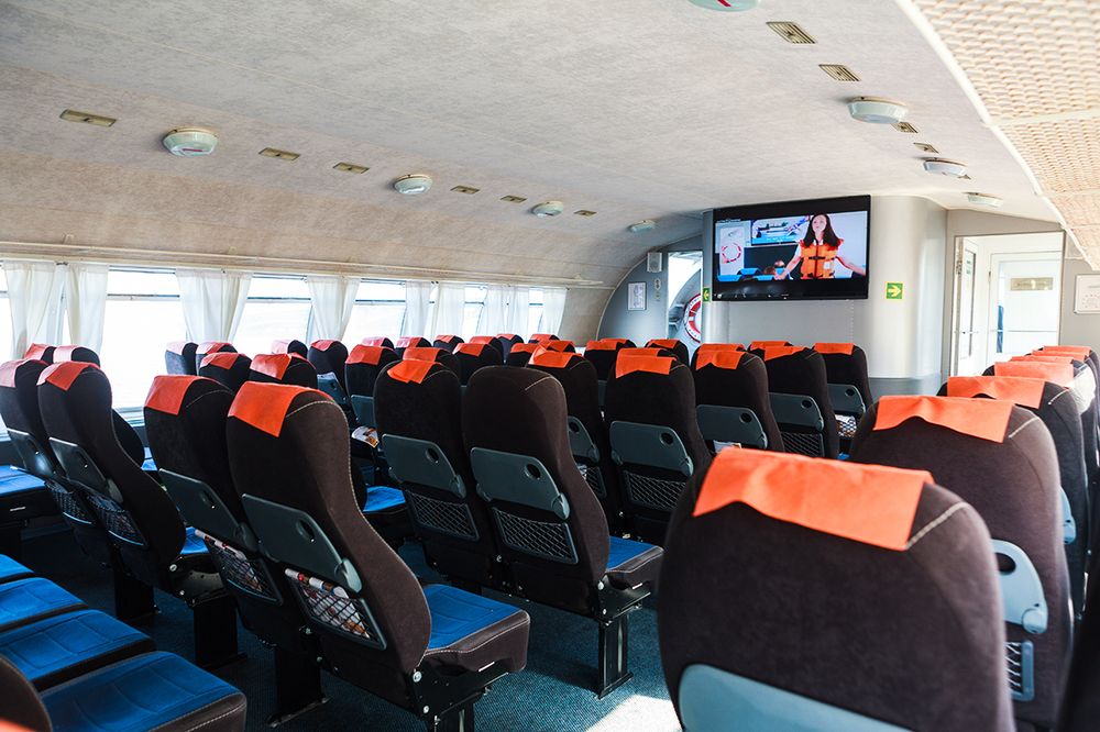 Несмотря на то, что «Метеор» – не прогулочный, а скоростной теплоход, он не уступает по комфортабельности многим судам других классов. Все три его салона оснащены мягкими креслами и удобными столиками, а если Вы желаете иметь наилучший обзор, то лучше расположиться в носовой части, где находится панорамное остекление.