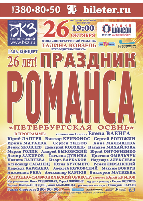 Старинные, городские, современные, зажигательные, цыганские, театральные романсы из кинофильмов – все направления многогранного жанра романса будут представлены в гала-концерте «ПРАЗДНИК РОМАНСА «Петербургская осень» в БКЗ «Октябрьский».