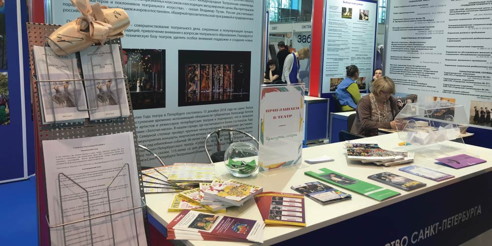 На стенде представлена информация о наиболее крупномасштабных культурных проектах этого года, объявленного в России Годом театра.