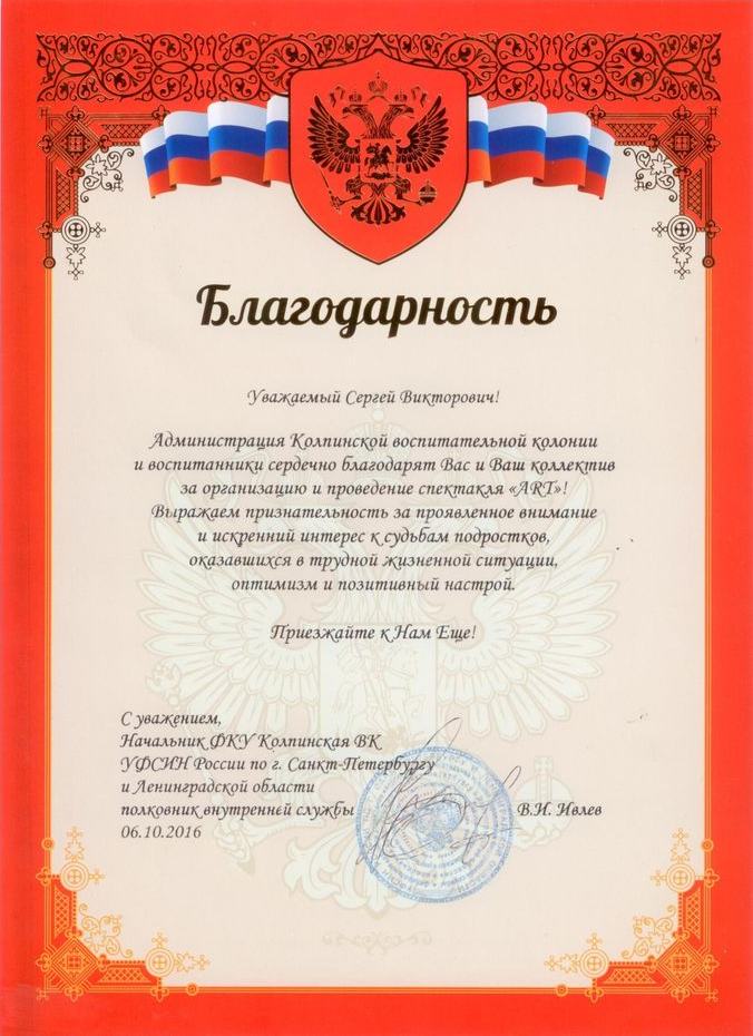 15 сентября совместно с Комитетом по молодежной политике и взаимодействию с общественными организациями в Колпинской воспитательной колонии состоялся показ спектакля «Art» Государственного драматического театра на Васильевском.