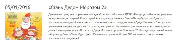 25 декабря 2016 года «Дирекция театрально-зрелищных касс» совместно с Комитетом по образованию провела новогоднюю елку в театре «На Литейном» для детей из социально-незащищенных семей.