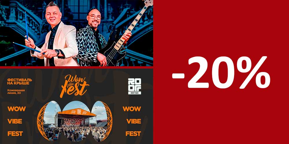 В рамках акции билеты на фестиваль 26 июня 2025 г. WOW VIBE FEST на крыше ROOF PLACE и на концерт 19 июля 2025 г. Данил Прокопьев и Juan Horlendis band во Дворце Белосельских-Белозерских можно приобрести на 20% ниже первоначальной цены по промокоду «WOWVIBE»*