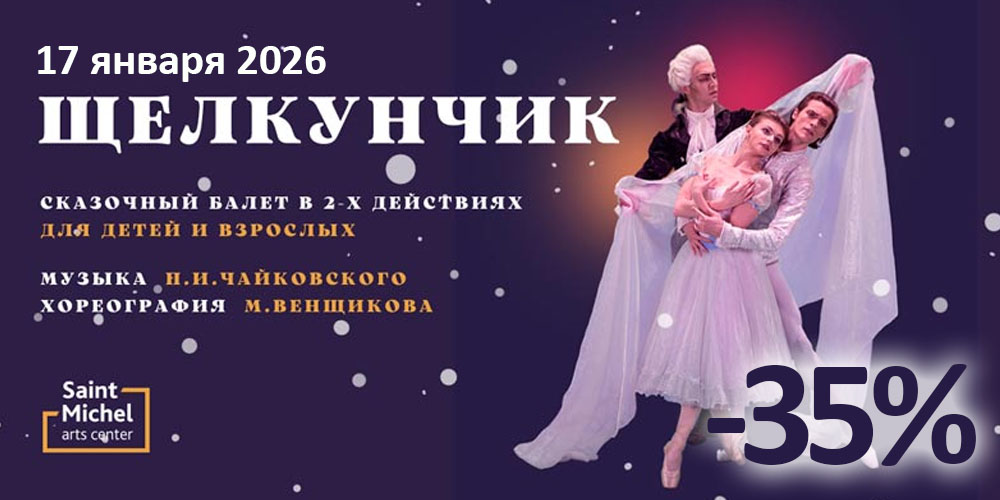 В рамках акции билеты на балет «Щелкунчик» 17 Января в Доме Учёных можно приобрести со скидкой 35% по промокоду «СЕНМИШЕЛЬ»