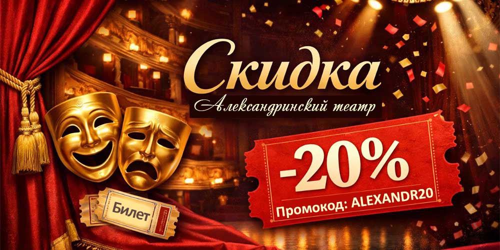 В рамках акции билеты в Александринский театр на избранные мероприятия можно приобрести со скидкой 20% по промокоду «ALEXANDR20»