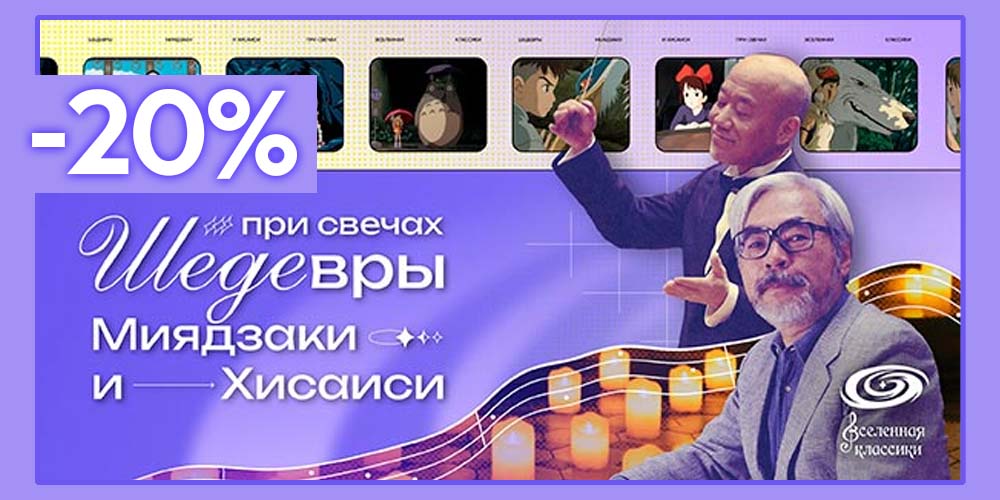 В рамках акции билеты на концерт «Шедевры Миядзаки и Хисаиси при свечах» в Российской национальной библиотеке 25 апреля 2026 можно приобрести со скидкой 20% по промокоду «CONCERT20»