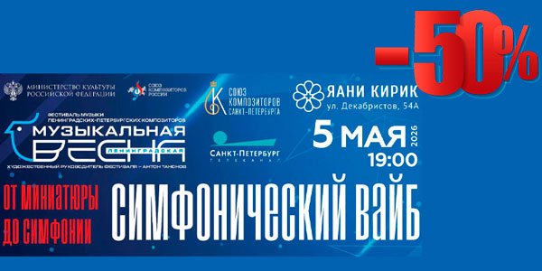 В рамках акции билеты на концерт «Симфонический вайб: от миниатюры до симфонии» в Протестантской церкви «Яани кирик» 5 мая можно приобрести со скидкой 50% по промокоду «СИМФО50»
