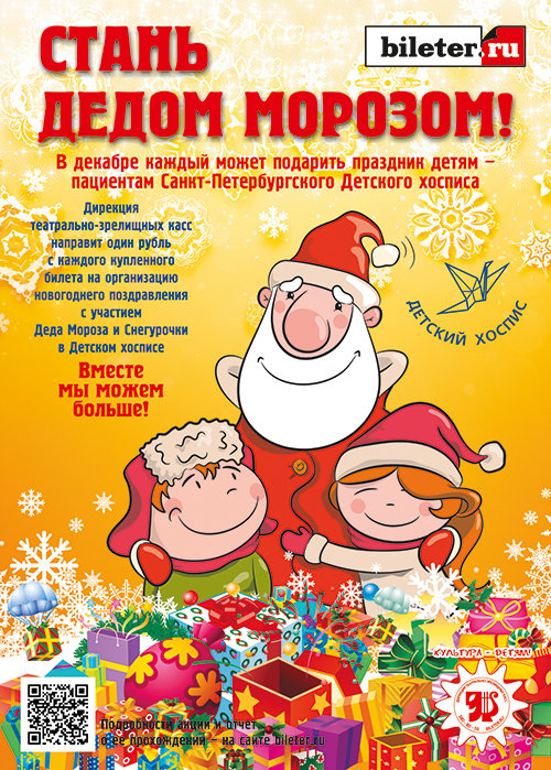 Дирекция театрально-зрелищных касс направит один рубль с каждого купленного билета в театральных кассах Дирекции, на сайте www.bileter.ru или по телефону 380-80-50 на организацию новогоднего выездного поздравления с участием Деда Мороза и Снегурочки для детей Детского хосписа.