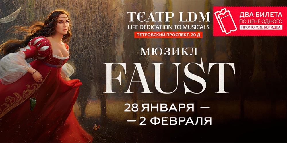Два билета по цене одного в ЛДМ на мюзикл «Фауст. Пари дьявола» 28 января - 2 февраля 2025 по промокоду «БЕРИДВА»
