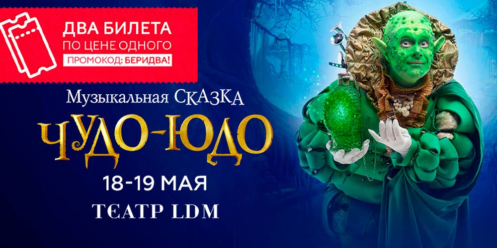 Два билета по цене одного в ЛДМ на музыкальную сказку «Чудо-Юдо» 18-19 мая 2024 по промокоду «БЕРИДВА!»