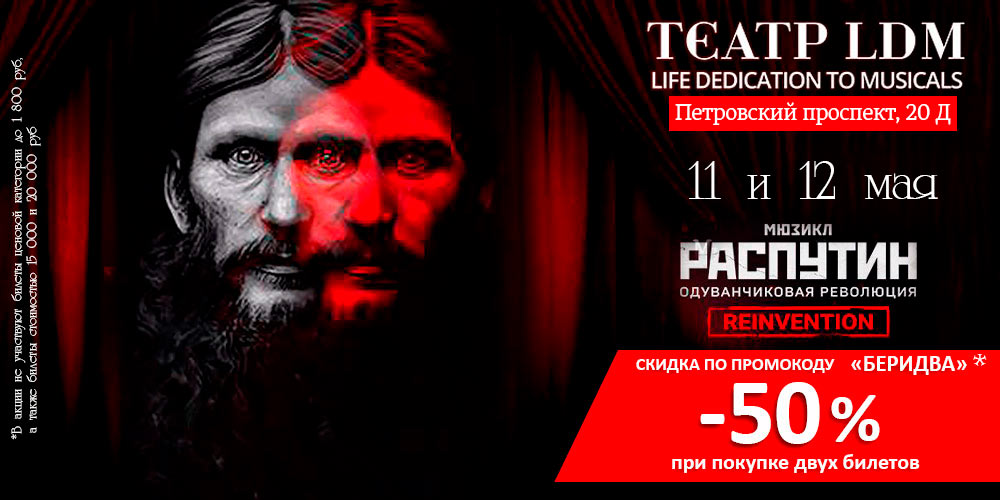 Скидка 50% при покупке двух билетов в ЛДМ на мюзикл «Распутин. Одуванчиковая революция» 11-12 мая 2024