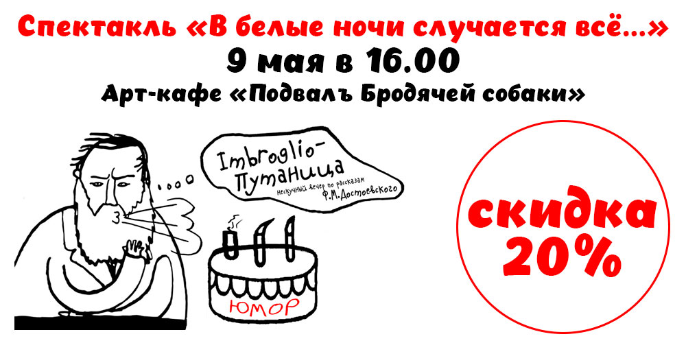Скидка 20% на спектакль «В белые ночи случается всё…» в Арт-кафе «Подвалъ Бродячей собаки» 9 мая 2024