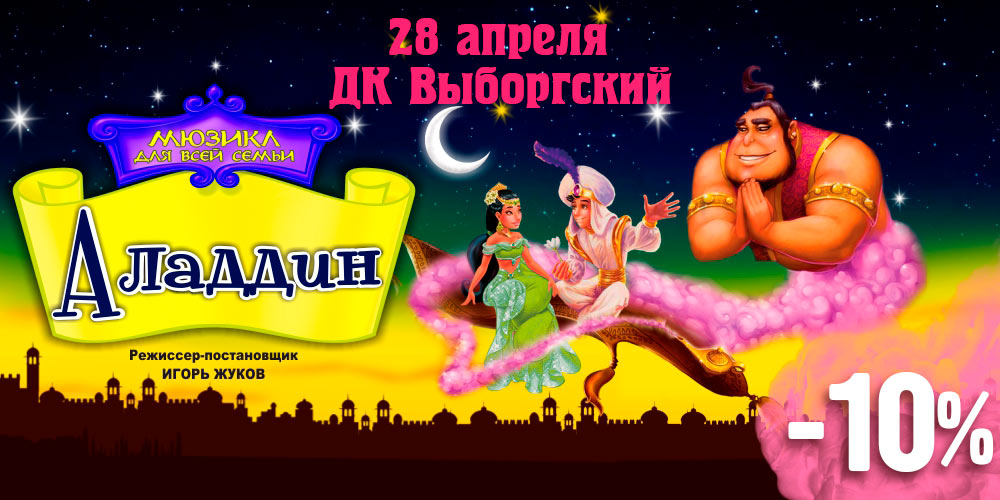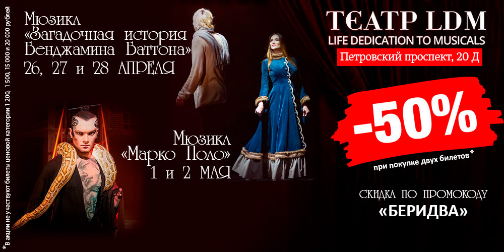 Скидка 50% при покупке двух билетов в ЛДМ на мюзикл «Марко Поло» 26, 27 и 28 апреля 2024 и мюзикл «Загадочная история Бенджамина Баттона» 1 и 2 мая 2024 по промокоду «БЕРИДВА»