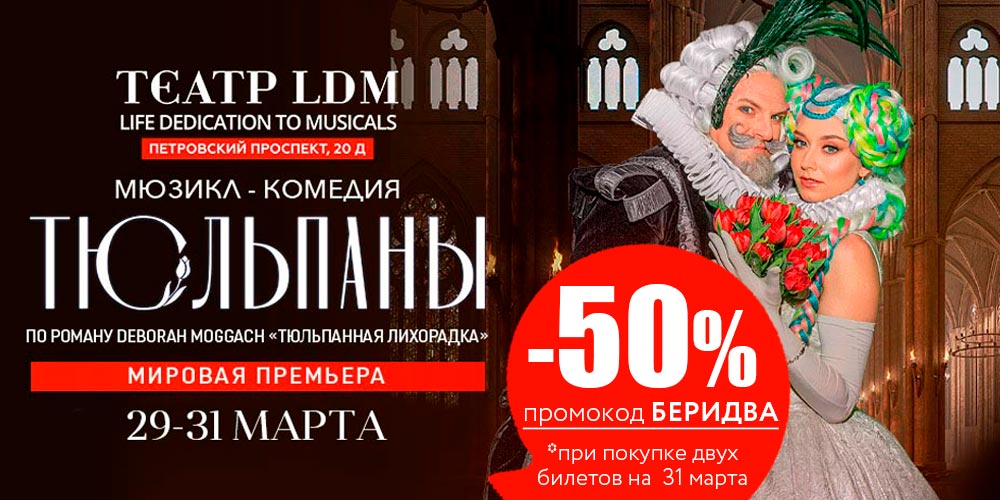 Скидка 50% при покупке двух билетов в ЛДМ на мюзикл «Тюльпаны» 31 марта 2024 по промокоду «БЕРИДВА»