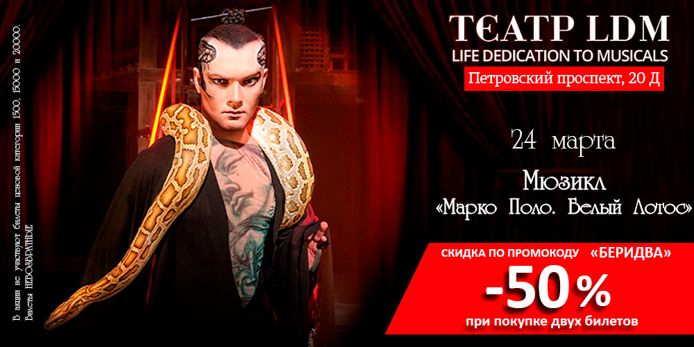 Скидка 50% при покупке двух билетов в ЛДМ на мюзикл «Марко Поло. Белый Лотос» 24 марта 2024 по промокоду «БЕРИДВА»