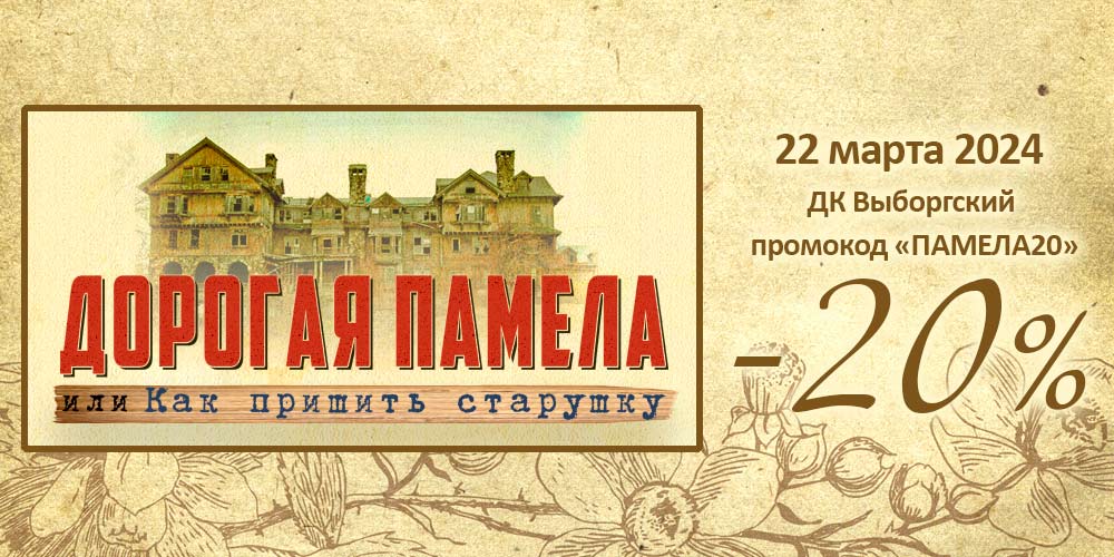Скидка 20% на спектакль «Дорогая Памела или как пришить старушку» в ДК Выборгский 22 марта 2024 по промокоду «ПАМЕЛА20»