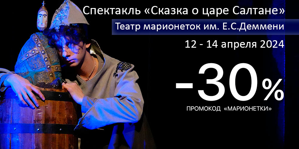 Скидка 30% на спектакль «Сказка о царе Салтане» 12, 13 и 14 апреля 2024 в Театре марионеток им. Е.С.Деммени по промокоду «МАРИОНЕТКИ»