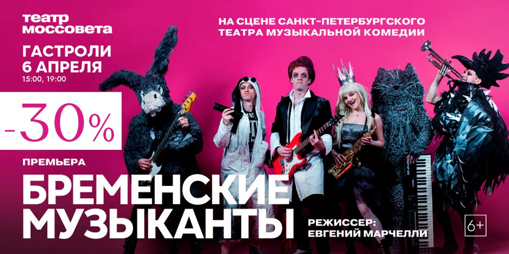 Скидка 30% на музыкальную сказку «Бременские музыканты» от Театра Моссовета по промокоду «МУЗЫКАНТЫ»