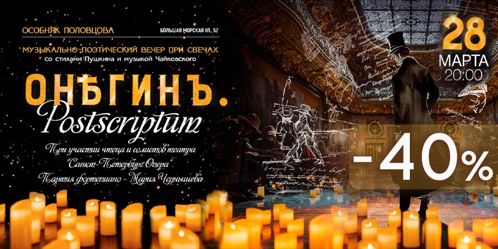 Скидка 40% на Вокально-поэтический концерт при свечах и розах «Онегин. Postscriptum» 28 марта в Доме Архитектора (Особняке Половцова) по промокоду «ОНЕГИН40»
