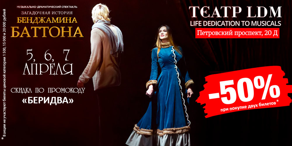 Скидка 50% при покупке двух билетов в ЛДМ на мюзикл «Загадочная история Бенджамина Баттона» 5, 6, 7 апреля 2024 по промокоду «БЕРИДВА»