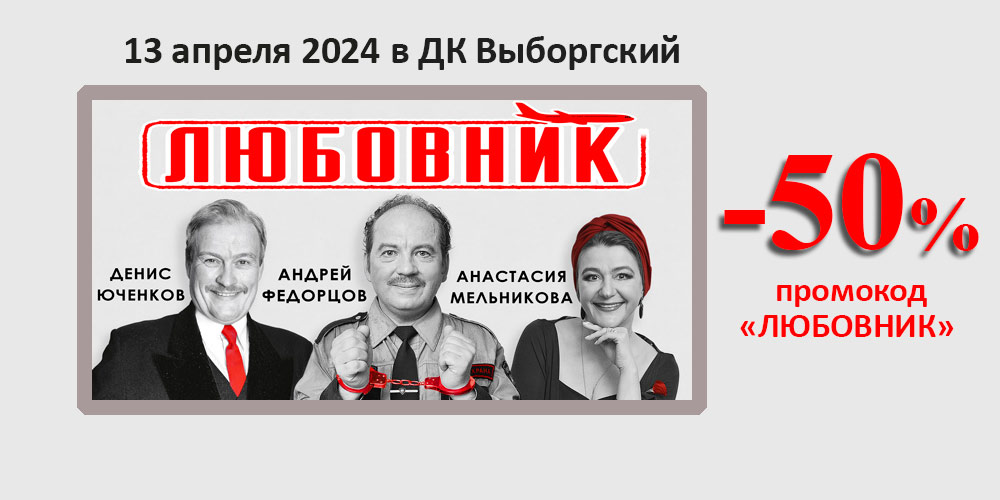 Скидка 50% на спектакль «Любовник» в ДК Выборгский 13 апреля 2024 по промокоду ЛЮБОВНИК