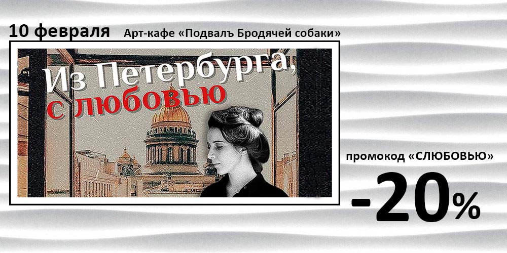 Скидка 20% на Спектакль-концерт «Из Петербурга с любовью» в Арт-кафе «Подвалъ Бродячей собаки» 10 февраля по промокоду «СЛЮБОВЬЮ»